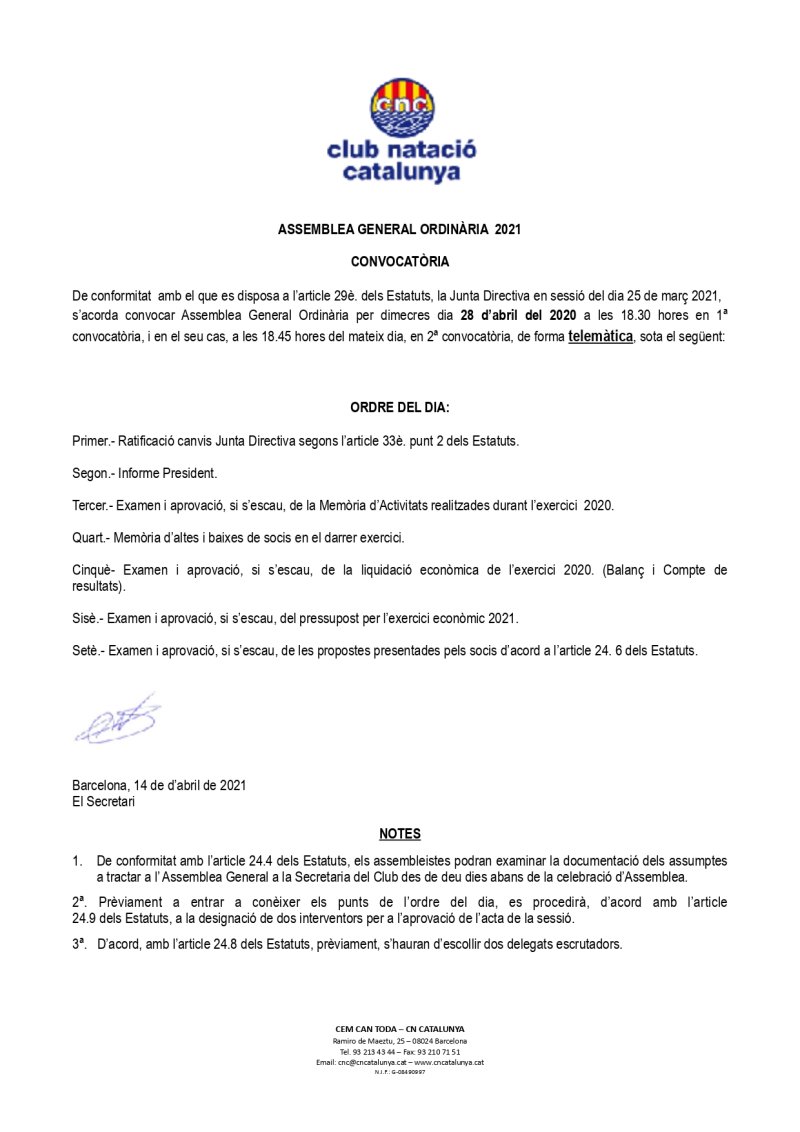 Dada la situación de excepcionalidad que estamos viviendo generada por la pandemia y siguiendo las indicaciones de las autoridades sanitarias, este año el Club Natación Cataluña volverá a celebrar la Asamblea Ordinaria de Socios de manera telemática el próximo 28 de abril.